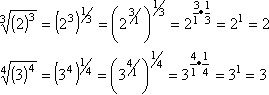 Whenever you see a fractional exponent, remember that the numerator (that is, the top number) is the power, and the denominator (that is, the bottom number) is the root. For instance:
