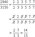 I'll grab my calculator and some scrap paper, and factor the numerator (top number) and denominator (bottom number). A quick shorthand for getting the prime factorization of each of these numbers is demonstrated below, in the stacked division (by prime numbers) of 2940: