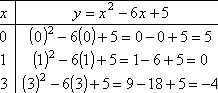 For instance, suppose they give us y = x2 − 6x + 5. There are any number of things we can do to help ourselves graph this correctly. We can start by finding the x- and y-intercepts. (For more info, please see Intercepts.) In this case, the intercepts are at (1, 0), (5, 0), and (0, 5).