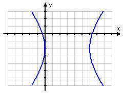 An hyperbola looks sort of like two mirrored parabolas, with the two halves being called "branches". Like an ellipse, an hyperbola has two foci and two vertices; unlike an ellipse, the foci in an hyperbola are further from the hyperbola's center than are its vertices, as displayed below: