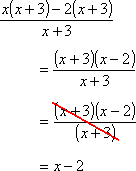 Or, alternatively, I can note that the terms in the numerator do indeed have a common factor; it's just that this common factor is rather large. Since both terms in the numerator contain the factor "x + 3", then this is a common factor, and it can be factored out front. Then the big factor out front will cancel with the denominator: