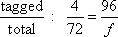 I'll use " f " to stand for the total number of fish in the lake, and set up my ratios with the numbers of "tagged" fish on top. Then I'll set up and solve the proportion: