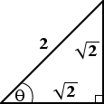 The hypotenuse of this triangle, shown above as 2, is found by applying the Pythagorean Theorem to the right triangle with sides having length . The base angle, at the lower left, is indicated by the "theta" symbol (θ, THAY-tuh), and is equal to 45°. So how does knowing this triangle help us?